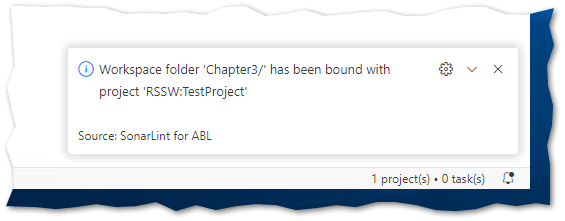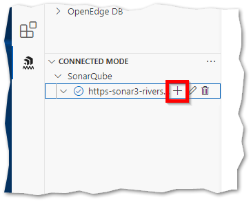 Now that the SonarQube connection is set up, we'll attach the current project to the SonarQube project. This will automatically retrieve the quality profile (i.e., the rules executed on the ABL code), the settings, and all issues flagged as false positives or "won't fix" so they don't appear in VS Code. Click on the "+" icon next to the SonarQube server name to proceed.